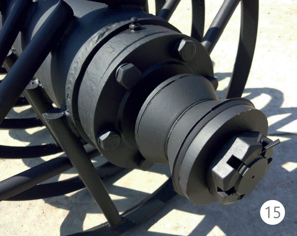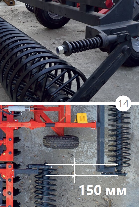 14. Опорный спиральный шлейф-каток. Распределяет почву равномерно без образования борозд и гребней. Спираль катка (выполнена из 25 мм квадрата) состоит из двух частей (с правой и левой навивкой). Отдаление шлейф-катков от рамы орудия препятствует забиванию на влажных почвах. Катки установлены с гарантированным перекрытием 150 мм. Амортизационная система регулировки (пружина, расположенная на балке катка) нивелирует ударные нагрузки от работы катка и позволяет дополнительно регулировать глубину обработки почвы, обеспечивая копирование рельефа.