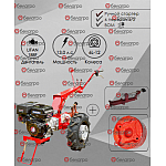Мотоблок предназначен для выполнения пахоты легких почв, боронования, культивации, междурядной обработки картофеля и свеклы, кошения трав в садах и огородах, на пришкольных и приусадебных участках, а также для транспортирования грузов, стационарных работ с приводом от вала отбора мощности.