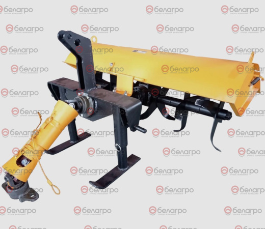 Фреза агрегатируется через карданный вал и кронштейн с ВОМ и рычагами навесного устройства мини-трактора.