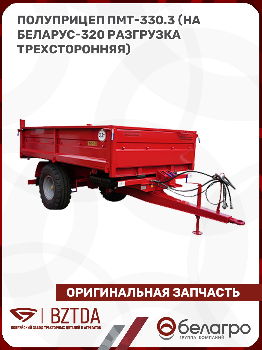 Прицеп тракторный самосвальный предназначен для перевозки различных сельскохозяйственных и промышленных грузов по всем видам дорог и в полевых условиях. Полуприцеп агрегатируется с тракторами БЕЛАРУС-320 и БЕЛАРУС-422, имеющими тягово-сцепное устройство ТСУ-1М. Полуприцеп производства РУП «БЗТДиА» ПМТ-330.3 предназначен для транспортировки различных сыпучих грузов с выгрузкой назад в коммунальных хозяйствах и дорожно-строительных предприятиях. В отличие от аналогов, полуприцеп имеет увеличенные размеры кузова, регулируемое по высоте и подрессоренное дышло, оснащен колодочными тормозами с пневмоприводом, осветительной аппаратурой, открывающимися боковыми и за-дними бортами, гидрооборудованием для разгрузки.