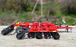 14. Опорный спиральный шлейф-каток. Распределяет почву равномерно без образования борозд и гребней. Спираль катка (выполнена из 25 мм квадрата) состоит из двух частей (с правой и левой навивкой). Отдаление шлейф-катков от рамы орудия препятствует забиванию на влажных почвах. Катки установлены с гарантированным перекрытием 150 мм. Аммортизационная регулировочная система (пружина, расположенная на балке катка) нивелирует ударные нагрузки от работы катка и позволяет дополнительно регулировать глубину обработки почвы, обеспечивая копирование рельефа.