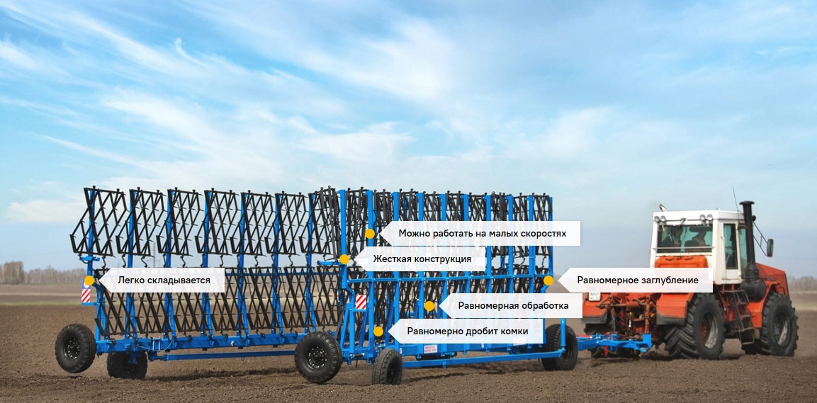 | Преимущества | Регулировка соединительными цепями дает одинаковую регулировку обработки передними и задними зубьями/Рама бруса сечением 200x200x10 мм обеспечивает жесткость конструкции, исключает изгибание и деформацию при нагрузках/Бестроссовая конструкция (жеская система балансировки) дает возможность движения задним ходом в рабочем положении/Равномерное заглубление: крылья всегда параллельны благодаря опорно-рычажной системе фиксации крыльев./шахматное расположение борон обеспечивает 100% перекрытие и как итог равномерную обработку почвы/Широкие колеса (16,5/70-18 (размер 1065х420-457)) менее подвержены проваливанию в период раннего весеннего боронования влажного поля. /Перевод из рабочего положения в транспортное и обратно выполняется одним трактористом с помощью гидравлического привода и механизма фиксации жесткой сцепки. Операция по подготовке бороны к работе или транспортировке - занимает не более 5-ти минут и может быть выполнена одним механизатором. /Есть возможность работы на малых скоростях с меньшей нагрузкой на трактор/преимущества/Все шарнирные соединения обеспечены подводами смазки, все оси вращения, винты упрочнены термообработкой и защищены от коррозии оксикарбонитрацией. |