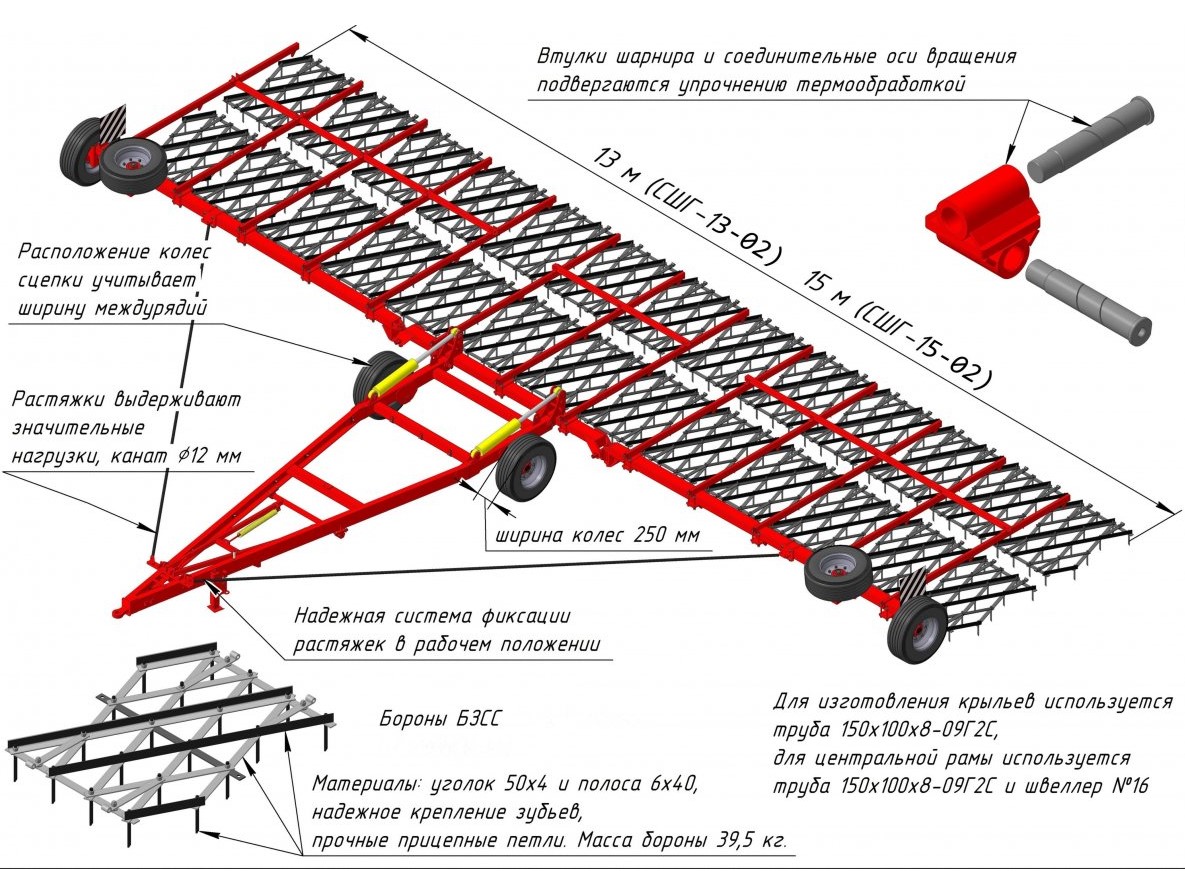 Сцепка универсальная СШГ-23-01 предназначена для довсходового и послевсходового боронования технических и зерновых культур, разрушения почвенной корки, уничтожения сорной растительности и выравнивания поверхности поля. После прохода сцепки по полю создается рыхлый мульчирующий слой, который прерывает капиллярный подток воды из нижележащих горизонтов почвы, при этом эффективно уничтожаются сорняки.