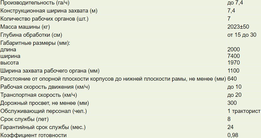 Плоскорез может работать при уклонах поверхности поля до 8o, влажности почвы в пределах 12 — 25% и твёрдости не более 3,5 МПа.