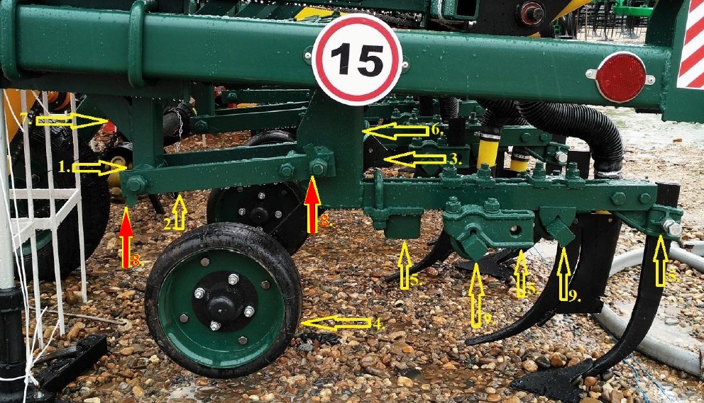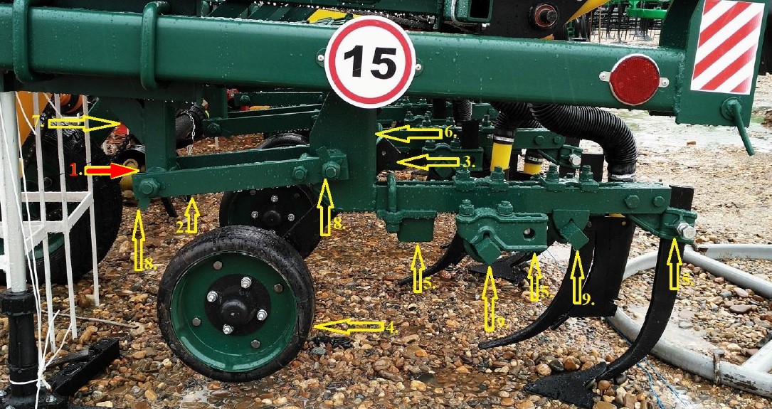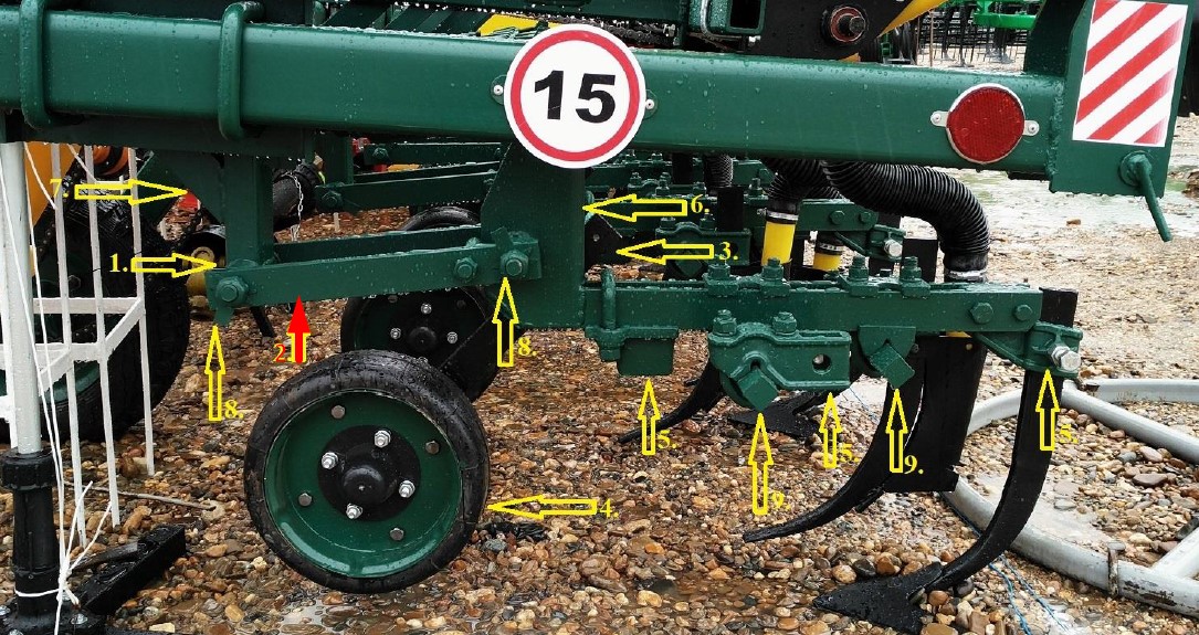 | Преимущества | 1. В параллелограммном механизме используются четыре подшипника скольжения ШСП-20 CRAFT. Втулки, в которых находятся подшипники, изготовлены из трубы 45*7 мм. бесшовной холоднодеформированной ГОСТ 8732-78./2. Усиленное соединительное звено из стальной полосы сечением 45*16 мм ст.45 обеспечивает высокую степень жёсткости конструкции./3. Кронштейн копирующего колеса изготовлен из полосы 45*16 мм ст. 3 и имеет бесступенчатую регулировку глубины обработки. Для удобства эксплуатации и регулировки глубины обработки на кронштейне имеется пластиковая ручка./4. Прикатывающее колесо с шиной атмосферного давления диаметром 300 мм позволяет точно копировать рельеф поверхности обрабатываемого участка./5. Используются держатели, которые произведены из высокопрочного чугуна ВЧ./6. Задний кронштейн изготовлен из цельного листа методом холодной штамповки с ребром жёсткости./7. Передний кронштейн секции, который присоединяется к раме усилен двумя большими косынками, что исключает порывы в этих местах./8. Использование стопорной шайбы вместо гровера препятствует откручиванию гаек./9. Стержень изготовлен из стали СТ.45 сечением 32мм./Покрытие – грунт-эмаль Arzender./На секциях имеется цепь для перевода культиватора в транспортное положение при дальнем перемещении культиватора. |