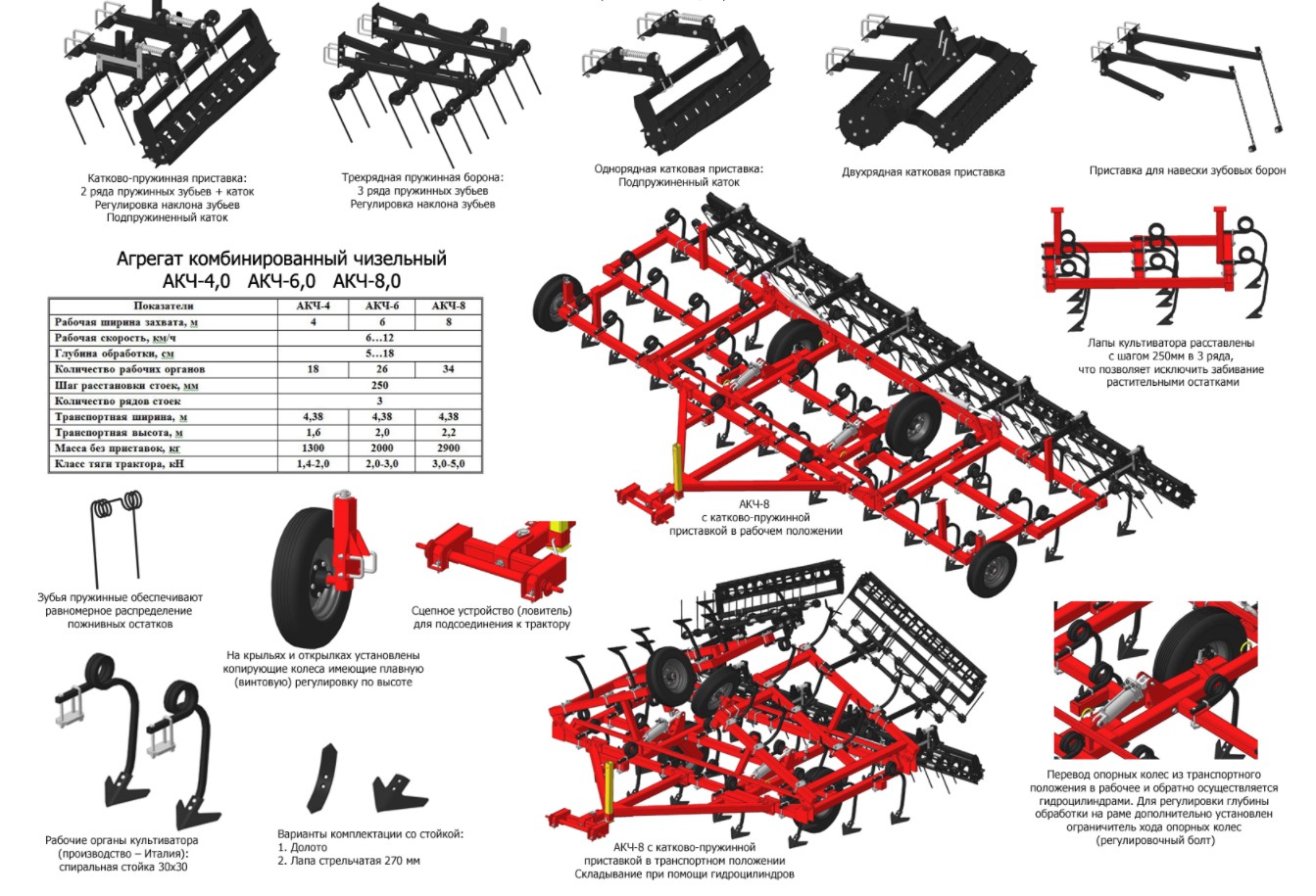 Агрегат комбинированный чизельный АКЧ-6,0 предназначен для безотвальной обработки всех типов почв с целью предотвращения эрозии, с одновременным рыхлением, подрезанием сорняков и заделкой растительных остатков с выравниванием и подповерхностным уплотнением почвы за один проход.
