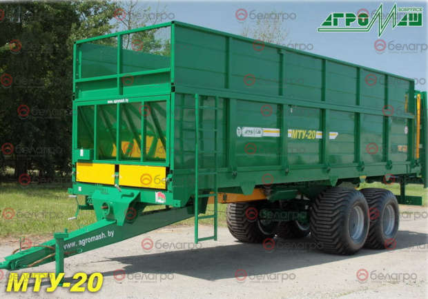 Машина МТУ-20-1 предназначена для транспортировки и сплошного поверхностного внесения твердых органических удобрений, а при снятом разбрасывающем органе - для  перевозки других сельскохозяйственных грузов с разгрузкой конвейером назад. Разбрасывающий орган, по выбору потребителя, может быть установлен в виде двух вертикальных барабанов (шнеков) или двух горизонтальных барабанов и двух роторов (дисков).