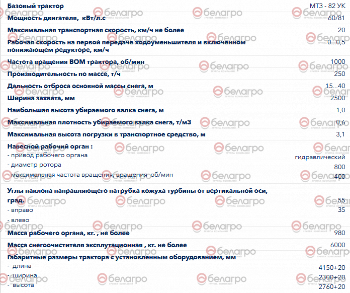 Отметим, что основное предназначение оборудования – отбрасывание снега в сторону от дороги равномерным слоем. При этом достигается максимальная скорость уборки до 250 тонн снега в час. В обоих режимах ротор снегоуборочный на МТЗ справляется со снежным покровом с плотностью до 0,6 т/м3 и высотой до 1 метра.